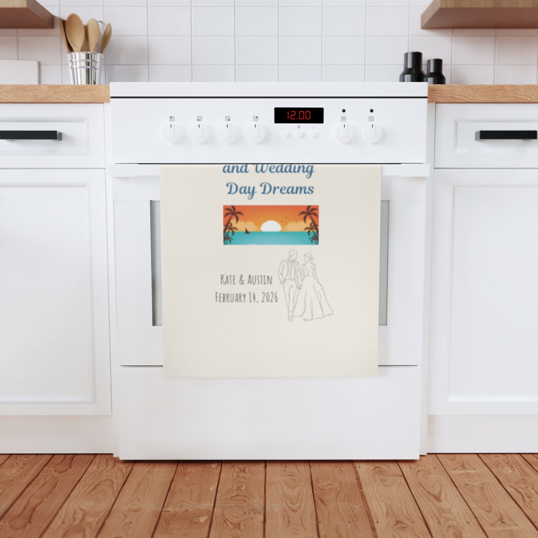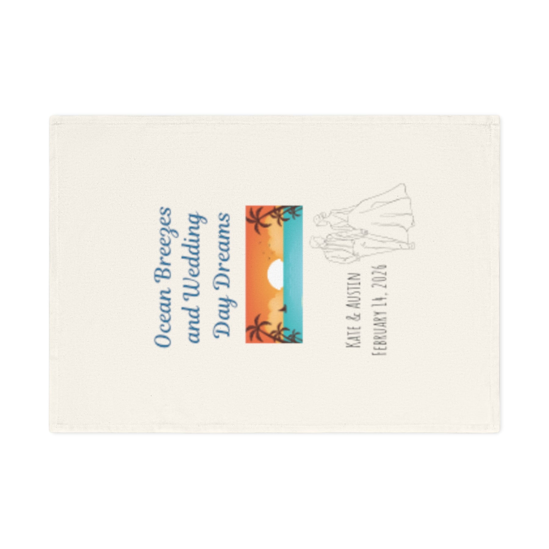 Celebrate love on island time with this dreamy tea towel. “Ocean Breezes and Wedding Day Dreams” brings a serene beach sunset scene to life, complete with your personalized names and wedding date. Made from eco-friendly organic cotton, this towel is equal parts romantic and functional—ideal as coastal wedding favors or keepsakes for beach-loving couples. Contact me to arrange for your perfectly personalized piece made just for you!