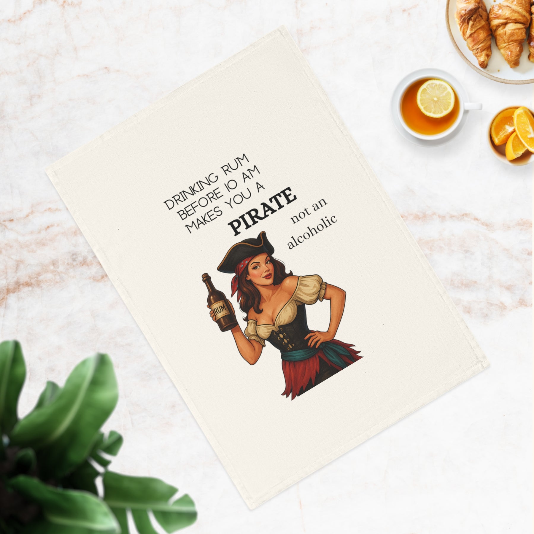 Start your day with a splash of sass and a shot of vintage humor—no judgment here. This cheeky 1950s-style tea towel features a glamorous pirate wench clutching a bottle of rum and delivering the ultimate morning motto: “Drinking rum before 10am makes you a pirate, not an alcoholic.” Printed on an organic cotton towel, this retro-inspired design is perfect for kitchens that like their charm with a twist of rebellion. Whether you're gifting a kindred spirit or elevating your own galley-style kitchen, this piece turns practicality into punchline-worthy panache.